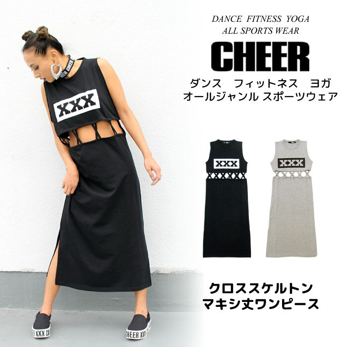 メール便可 ダンス ウェア【CHEER】 [チアー] クロス スケルトンデザイン マキシ丈ワンピース【ダンス 衣装 ヒップホップ ダンスふくや ワンピ ノースリーブ 網 ネット 重ね着 レイヤード ロゴ レディース キッズ ジュニア スポーツ 子供服 SALE セール】